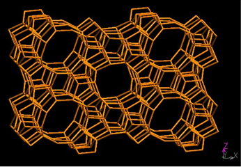 ZSM是Zeolites Socony Mobil的縮寫(xiě),ZSM-5沸石分子篩則是20世紀(jì)七十年代美國(guó)Mobil石油公司開(kāi)發(fā)成功的一系列新型的高硅鋁比沸石分子篩中其中的一種。它有著獨(dú)特的交叉孔道結(jié)構(gòu),都是10氧環(huán)組成,其直筒型孔道呈橢圓形,橫向孔道截面近似于圓形,孔口尺寸稍有區(qū)別。一組為平行于單胞的a軸,呈“Z”字形具有近似于圓形的開(kāi)孔,其尺寸為0.54×0.56nm;另一組平行于單胞的b軸,為直通道,但為橢圓開(kāi)口,其尺寸為0.51×0.57nm。ZSM-5晶體屬于理想的斜方晶系,其結(jié)構(gòu)參數(shù)為a=20.1,b=19.9,c=13.4。